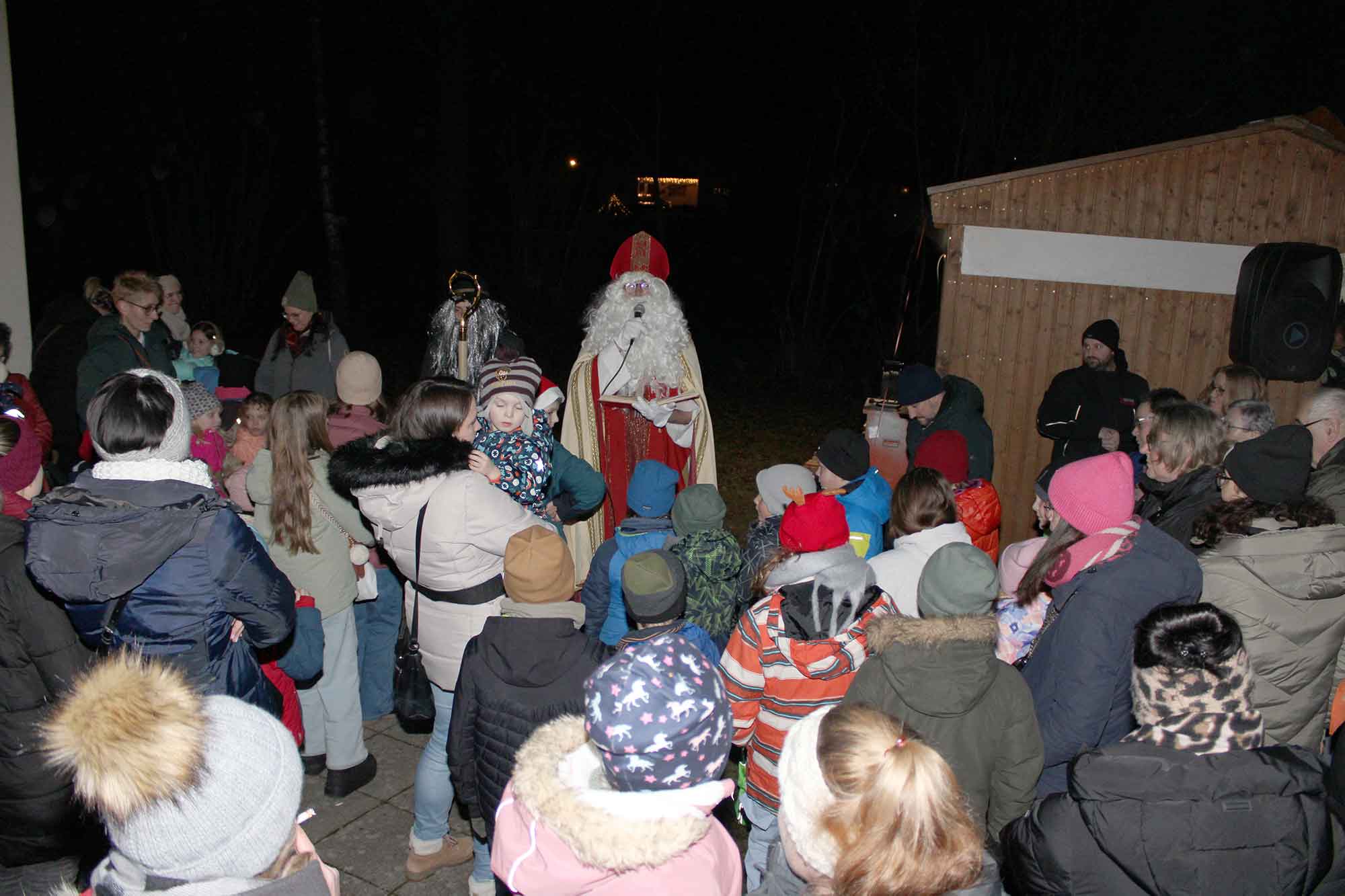 Zahlreiche Kinder samt Eltern umzingelten den Nikolaus und den Krampus.