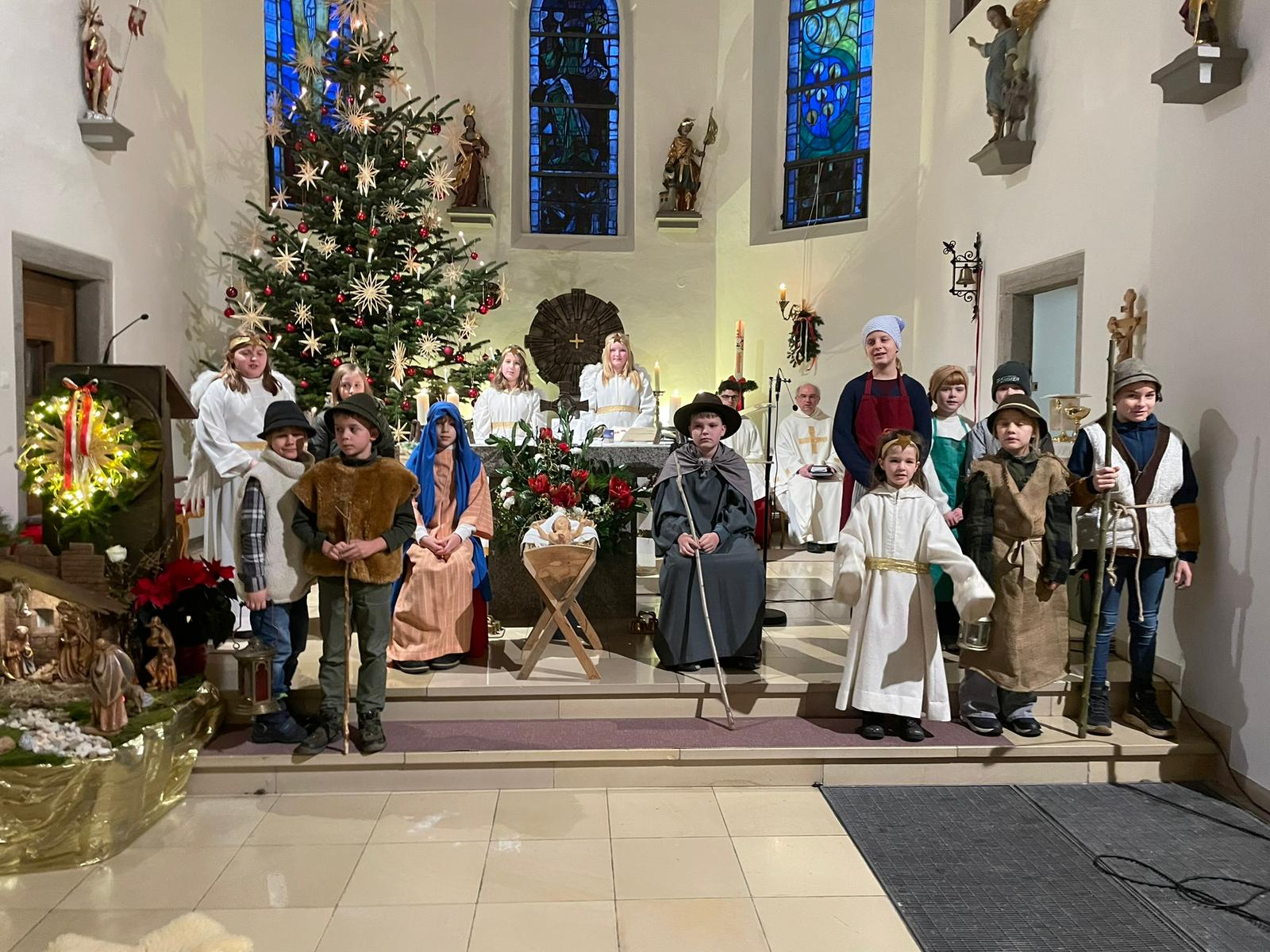 Nach dem Weihnachtsevangelium wurde von den vielen Kindern die Geburt Jesu Christi im Stall zu Bethlehem im Krippenspiel dargestellt. Unter der Leitung von Simone Fischer, Bianca Saurer und Mesnerin Gabi Mayer wurden die Kinder in ihrer persönlichen Rolle eingeübt und so wurde dieses Krippenspiel ein Erlebnis für die Kirchenbesucher. Maria und Josef auf Herbergssuche bei den Wirten in Bethlehem, die Begegnung mit den Hirten und das freudige Auftreten der Engelschar wurde eins in dieser Heiligen Messe. Den feierlichen Schlusssegen spendete Pfarrer Merl an die Gottesdienstbesucher. Durch die Geburt seines Sohnes hat die Finsternis vertrieben und diesen Tag mit dem Glanz seines Lichtes erleuchtet. Er schenke allen Menschen den guten Willen seinen Friedens. Mit dem Lied „Stille Nacht“ in der dunklen Pfarrkirche, erhellt nur durch den Christbaum, endete dieser Festgottesdienst.