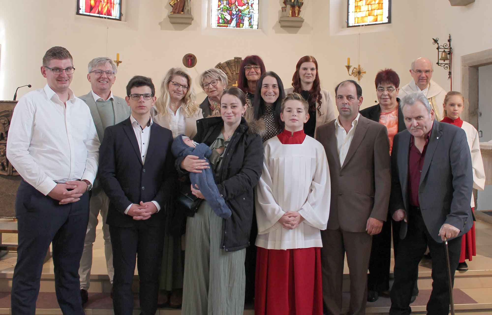 In der Pfarrkirche St. Bartholomäus fand letzten Sonntag eine Tauffeier für Leon Grüneisl statt. Getragen vom Paten Hannes Grüneisl, der Bruder von Natalie Grüneisl, empfing der Täufling im Beisein der Eltern und der Verwandtschaft von Pfarrer Franz Merl symbolisch das weiße Taufkleid, wurde mit Öl gesalbt und dem gesegneten Wasser getauft, um damit zur Glaubensgemeinschaft der Christen zu gehören.