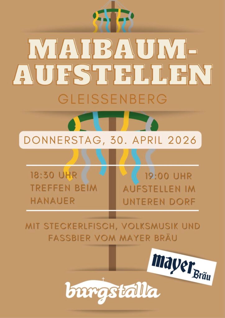 Die Mitglieder des Trachtenvereins „D‘ Burgstalla“ haben bereits alle Vorkehrungen getroffen, damit kommenden Donnerstag im Unteren Dorf wieder ein Maibaum aufgestellt werden kann. Bereits um 18 Uhr wird der Baum mit Blasmusik vom ehemaligen Sägewerk Hanauer bis zum Unteren Dorf transportiert und um 18:30 soll das Aufstellen beginnen. Die ganze Bevölkerung ist dazu eingeladen und die kräftigen Männer werden gebeten, beim Aufstellen mit anzupacken. Im Anschluss, bei einem gemütlichen Zusammensein, bieten die Trachtler ihren Besuchern Volksmusik, Steckerlfisch und Fassbier vom Mayerbräu.