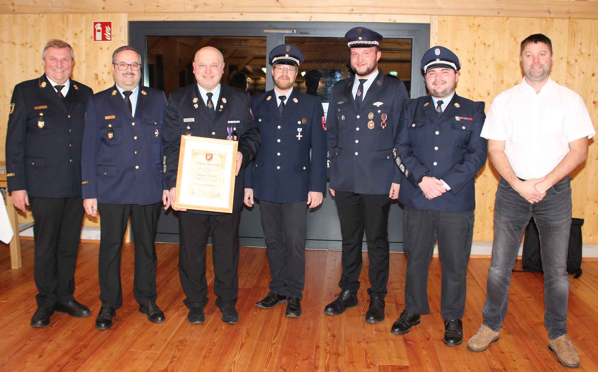 Kommandant Sebastian Riederer (r.) durfte seinen Vater Markus Riederer (im Vordergrund) zum Ehrenkommandanten ernennen.
